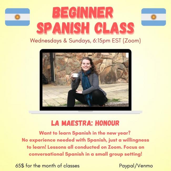 Want a fun way to learn Spanish? We host conversation-based virtual classes every Wednesday and Sunday from 6:15-7pm EST, with our native instructor Honour. Honour lived in Argentina, and can't wait to help you fall in love with learning Spanish. Classes are full at 7 students, as we like to keep the group small for individual attention. You will receive optional activities throughout the week as well to practice. Classes will begin January 4th, sign up early as space is limited.
