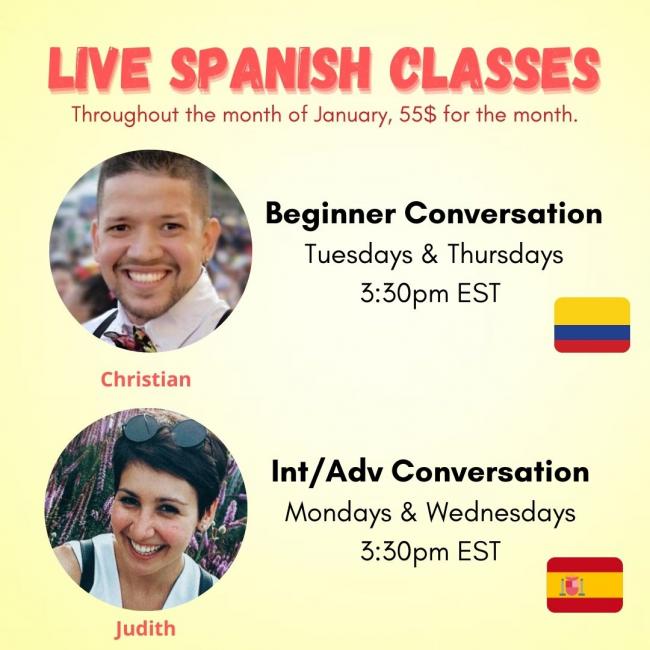 Want a fun way to learn Spanish? We host conversation-based virtual classes every Tuesday and Thursday from 3:30-4:15pm EST, with our native instructor Christian. Christian lives in Colombia, and can't wait to help you fall in love with learning Spanish. Classes are full at 7 students, as we like to keep the group small for individual attention. You will receive optional activities throughout the week as well to practice. Classes will begin January 4th, sign up early as space is limited.