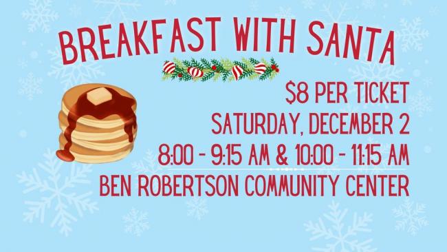 The Kennesaw-Acworth Optimist Club in partnership with Kennesaw Parks & Rec is hosting an "all-you-care-to-eat" breakfast complete, with pancakes, sausage, juice, coffee and table-to-table visits with the jolly old elf himself. Two seating options are available: 8 to 9:15 AM and 10 to 11:15 AM. Advance tickets are only $8 per person. Children two (2) years of age and under do not need a ticket; however they must sit on an adult's lap.