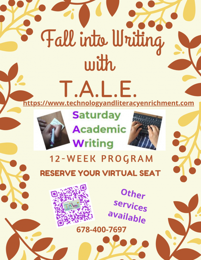 To maximize the benefits of writing instruction, students require individual support to guide them through any genre’s writing process. Saturday Academic Writing workshops are designed to engage students in the unique subject of writing for different genres. TALE offers a series of virtual one-on-one writing workshops on the weekends.