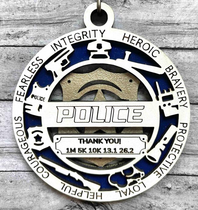 Honoring those who serve to protect, we are hosting our eighth annual “Law Enforcement Appreciation Day” 1m, 5K, 10K, 13.1, and 26.2 mile races. National Law Enforcement Appreciation Day is January 9th, 2023 and we invite you to complete your race anytime in January 2023! These medals are GARAGE MADE – that’s right, they were made right here in our very garage! We’ve been adding some locally made medals, and these ones are made of layered wood and turned out really cool. This medal is 4 inches and comes with a Virtual Race Events bib where you can write in your race, distance and time.