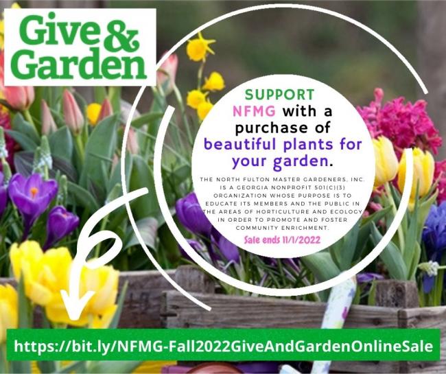 Please support the Fall 2022 "Give & Garden" Online Sale with a purchase of beautiful plants for your garden. Your plant purchases will help NFMG continue to provide quality horticultural education to the North Fulton Community and beyond. For each order, 50% of the proceeds will go directly towards helping NFMG meet our goal. Thank you for your continued support.