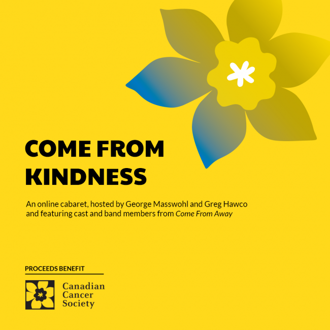 On May 4th and 5th, you are invited to join the sensational Come from Away cast and band for a one-of-a-kind virtual cabaret show in support of the Canadian Cancer Society. Featuring musical performances from cast and band members from various Come From Away productions, the event will be raising funds for people living with cancer during the COVID-19 pandemic. The event will be taking place Live on Facebook and will be hosted by Come From Away Toronto’s Greg Hawco and George Masswohl.