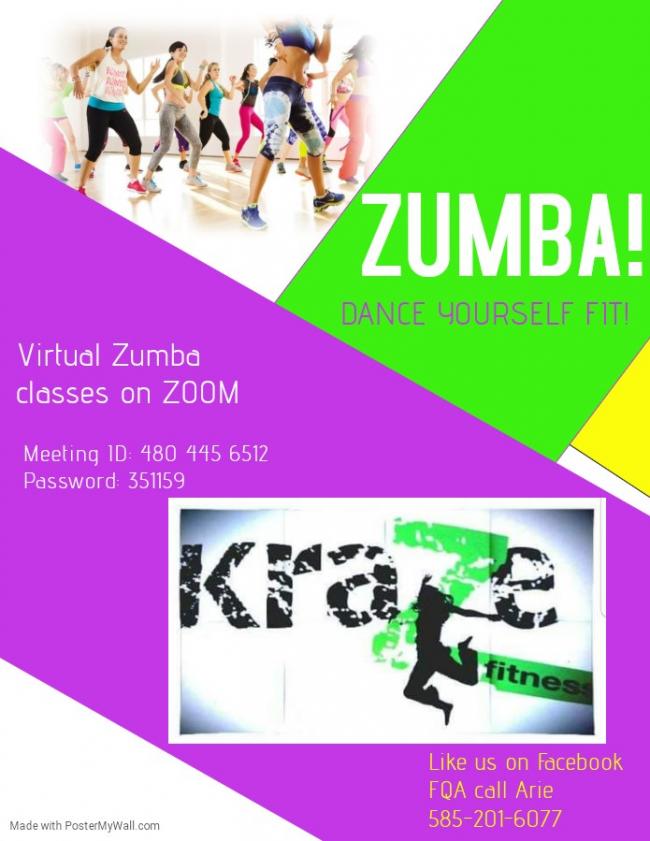 Classes are: Tuesday and Thursdays 6:30 PM / Saturday 10AM. VIRTUAL Zumba class log in via ZOOM Meeting ID 480 445 6512 PASSWORD: 351159